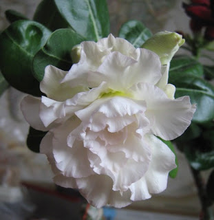 Вот и распустился второй бутон на моем махровом адениуме.  Слава Богу, сбылись самые благоприятные прогнозы доброжелательных комментаторов и цветочек оказался гораздо менее деформирован чем первый: